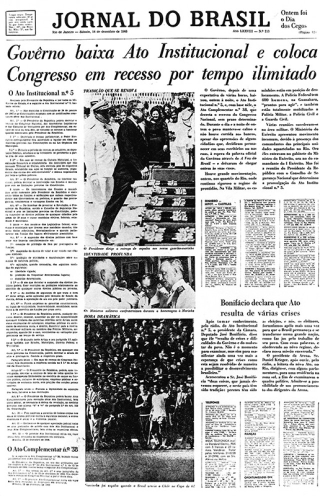 Na noite de 13 de dezembro, o ministro da Justiça, Luís Antônio da Gama e Silva, anuncia ao país em rede de rádio e TV o Ato Institucional nº 5 – uma lista de 12 artigos brutais que liquidava de vez com os resquícios do Estado de Direito e das liberdades democráticas no país. A partir daquela noite, o general presidente Arthur da Costa e Silva passava a ter poderes para fechar o Congresso – o que fez imediatamente –, as Assembleias e as Câmaras Municipais, de intervir nos governos estaduais e prefeituras e de afastar ministros do Supremo Tribunal Federal – o que viria a fazer nas semanas seguintes.