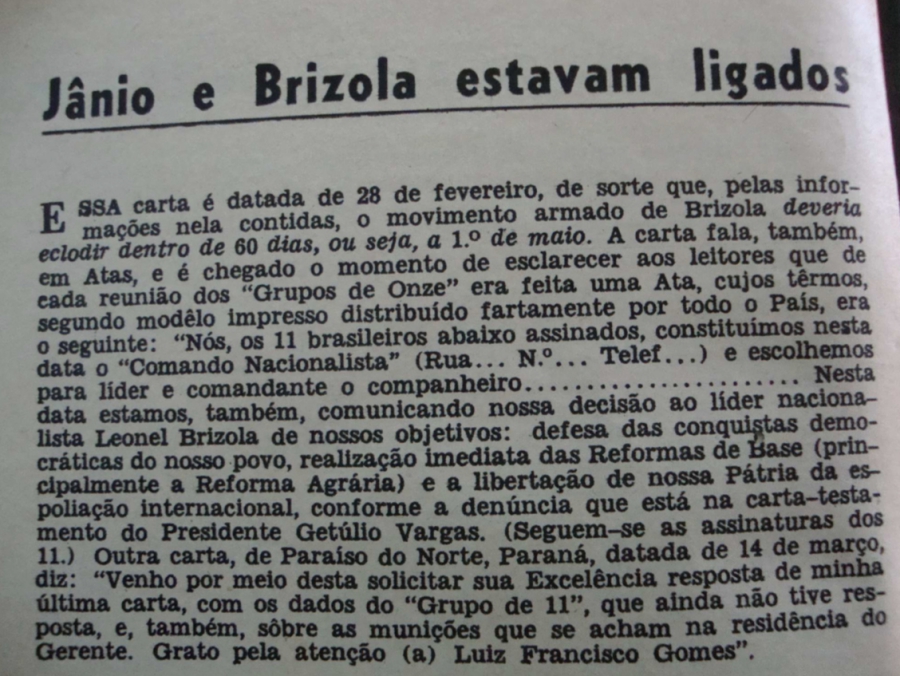 O ex-governador do Rio Grande do Sul Leonel Brizola usa seu programa semanal na Rádio Mayrink Veiga para preparar a resistência à ofensiva conservadora. Segundo ele, o Brasil caminha para o “grande desfecho” — a batalha final entre os dois polos ideológicos cada vez mais radicalizados, a direita e a esquerda —, e por isso conclama os ouvintes de qualquer canto do país a formar um Comando Nacionalista, ou “Grupo dos Onze Companheiros”, para defender o presidente João Goulart e as Reformas de Base.