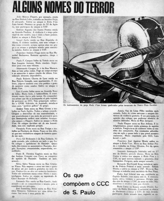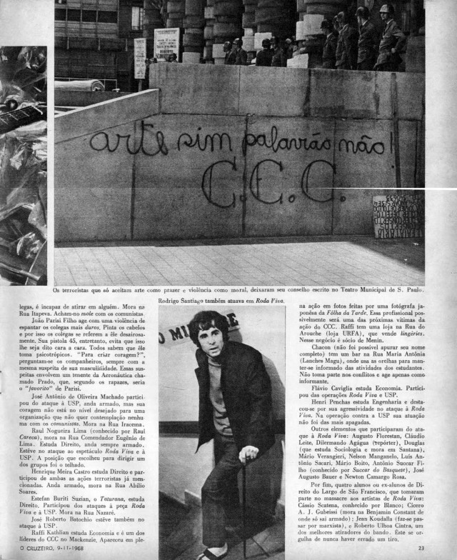 O Teatro Galpão, em São Paulo, é atacado e depredado por duas dezenas de integrantes do Comando de Caça aos Comunistas (CCC), grupo paramilitar de extrema direita criado um ano antes do golpe de 1964 e integrado por militares, policiais e jovens ligados a políticos de direita. O elenco da peça “Roda Viva”, de Chico Buarque, foi espancado e humilhado.