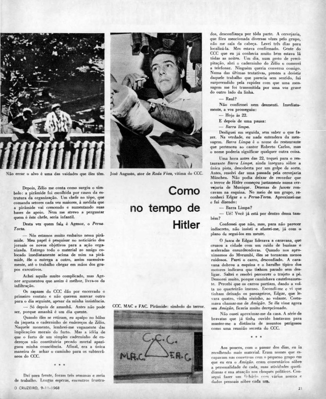 Em 3 de outubro, véspera da estreia de “Roda Viva” em Porto Alegre, o grupo paramilitar encheu a cidade de panfletos nos quais ameaçava a integridade física dos atores. No dia seguinte, depois do espetáculo, o elenco foi cercado por cerca de 200 pessoas na rua quando voltava ao hotel. A atriz Elizabeth Gasper e seu marido, Zelão, foram sequestrados por algumas horas. No Rio, em 2 de dezembro, o Teatro Opinião, que exibia “ Para Não Dizer que Não Falei das Flores”, de Geraldo Vandré, sofreu um atentado a bomba.