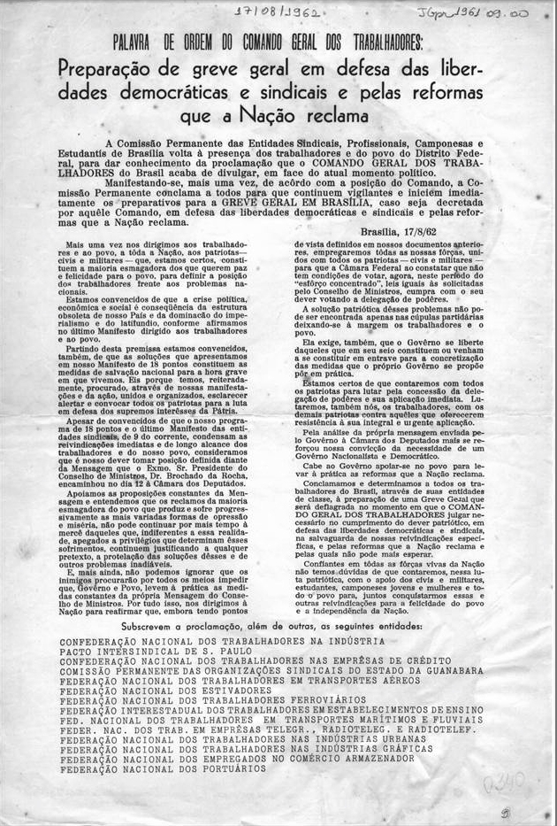 Com forte influência do Partido Trabalhista Brasileiro (PTB) e do Partido Comunista Brasileiro (PCB), é criado, no 4º Congresso Nacional dos Trabalhadores, o Comando Geral dos Trabalhadores (CGT), central sindical de orientação progressista e nacionalista e comprometida com a bandeira do retorno ao presidencialismo. Em contrapartida, exige do presidente João Goulart o fim da Lei de Segurança Nacional, extensão do voto a todos os adultos (inclusive analfabetos e soldados), aumento de 100% no salário mínimo e reformas agrária e bancária.