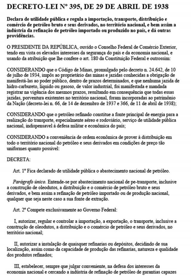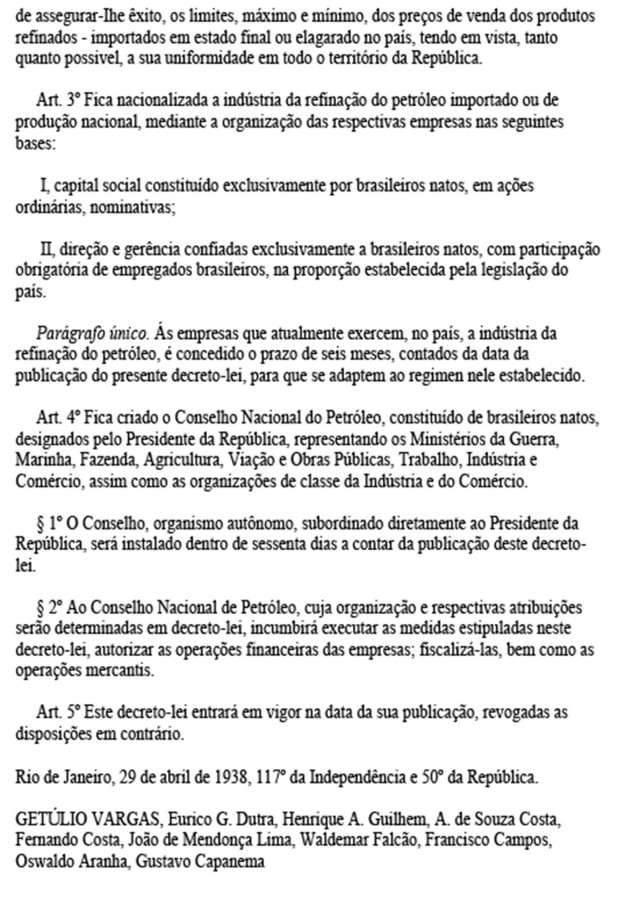 Getúlio baixa decreto-lei que regula e torna de utilidade pública a produção, importação, transporte, distribuição e comércio do petróleo bruto e seus derivados. O refino de petróleo, importado ou nacional, também passa para o controle estatal. Caberá à União autorizar, regular e controlar a importação, a exportação, o transporte — inclusive a construção de oleodutos —, a distribuição e o comércio do petróleo e seus derivados em todo o território nacional.