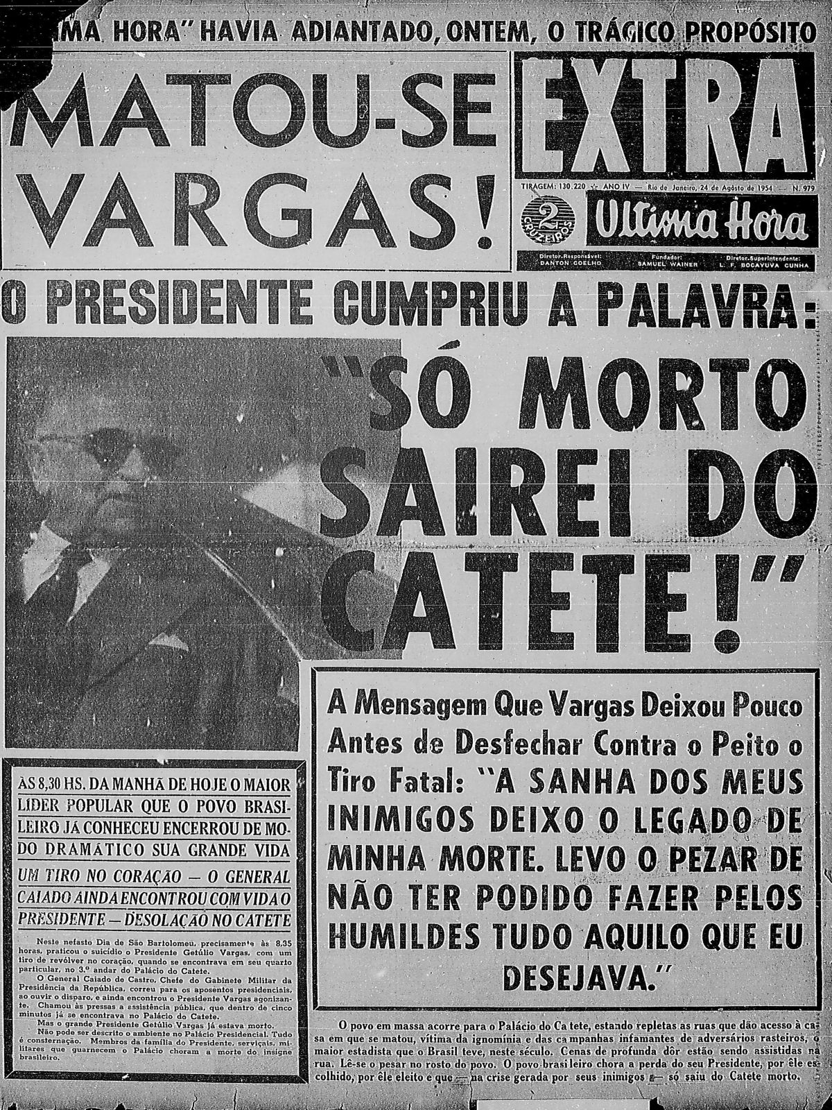 No Rio de Janeiro, capital da República, uma multidão amargurada, revoltada e colérica passou a percorrer as ruas, armada com paus, pedras e fúria. Arrancou dos postes propaganda da oposição, quebrou as vidraças da Standart Oil, apedrejou a fachada da embaixada dos Estados Unidos e os prédios onde funcionavam os jornais “O Globo” e “Tribuna da Imprensa”. Para arrematar, incendiou os caminhões que distribuíam esses jornais. Só a “Ultima Hora”, que era favorável ao governo Vargas, pôde circular naquele dia.