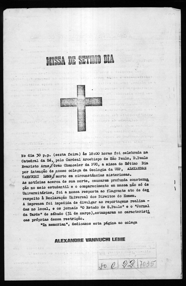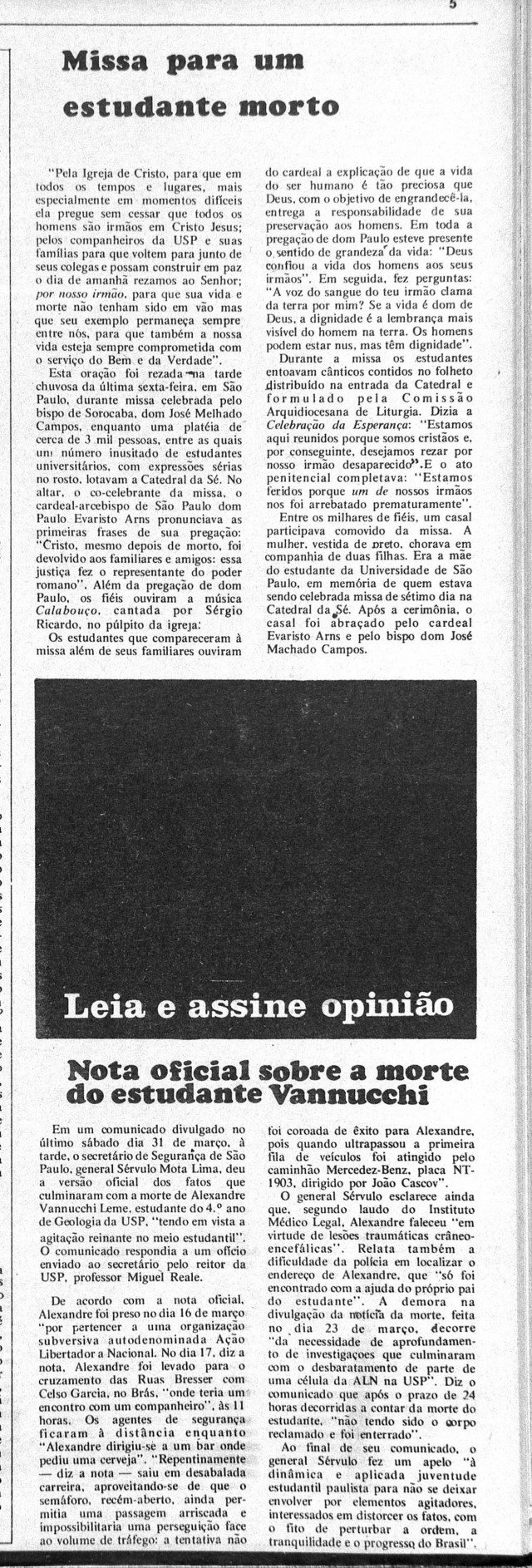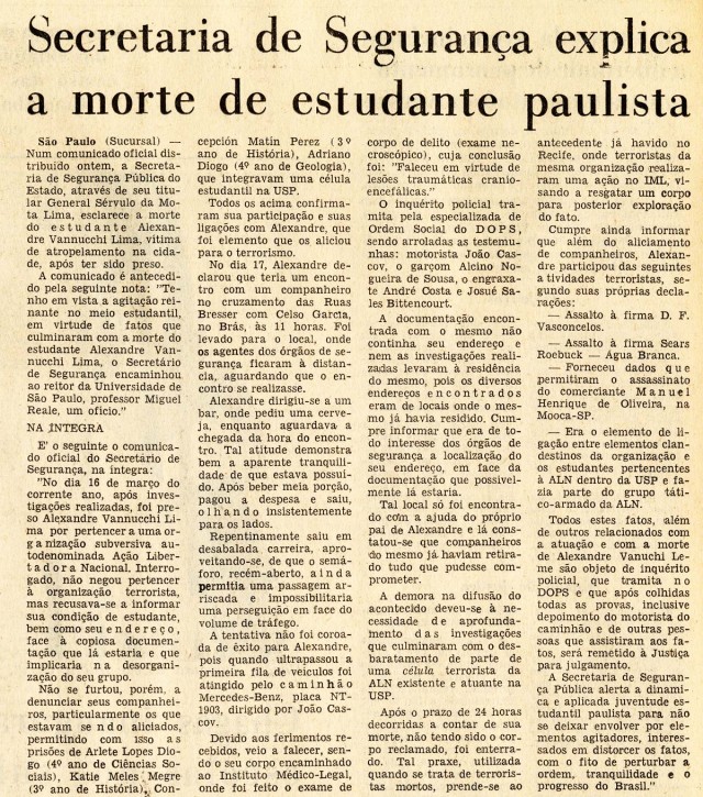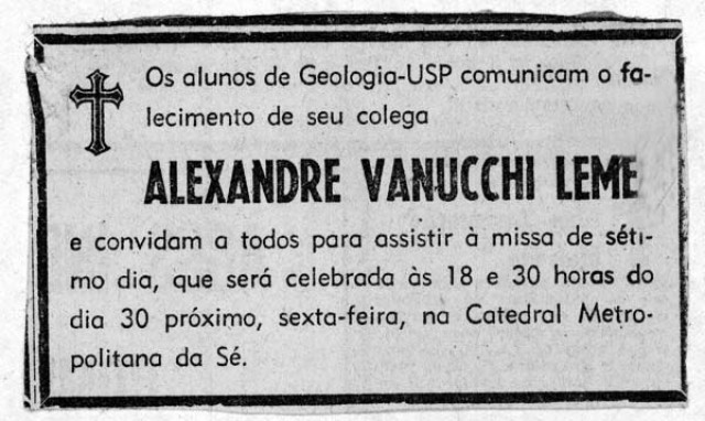 É assassinado sob torturas no DOI-Codi, 48 horas depois de ter sido preso, Alexandre Vannucchi Leme, estudante de geologia na Universidade de São Paulo (USP) e militante da Ação Libertadora Nacional (ALN). Oficialmente, a morte foi atribuída a atropelamento ao fugir da prisão. A falsa versão provocou indignação.
