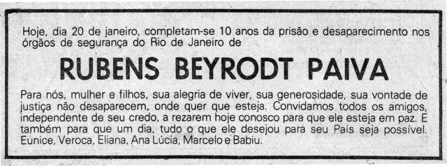 Agentes do Centro de Informações de Segurança da Aeronáutica (Cisa) invadem a casa do ex-deputado cassado Rubens Paiva (PTB-SP), no Rio. Acompanhado pelos militares, Paiva sai de sua residência no bairro do Leblon dirigindo o próprio automóvel até o comando da 3ª Zona Aérea, onde seria interrogado e espancado. Dali, foi transferido para o quartel da Polícia do Exército, na rua Barão de Mesquita, bairro da Tijuca, onde funcionava o DOI-Codi.