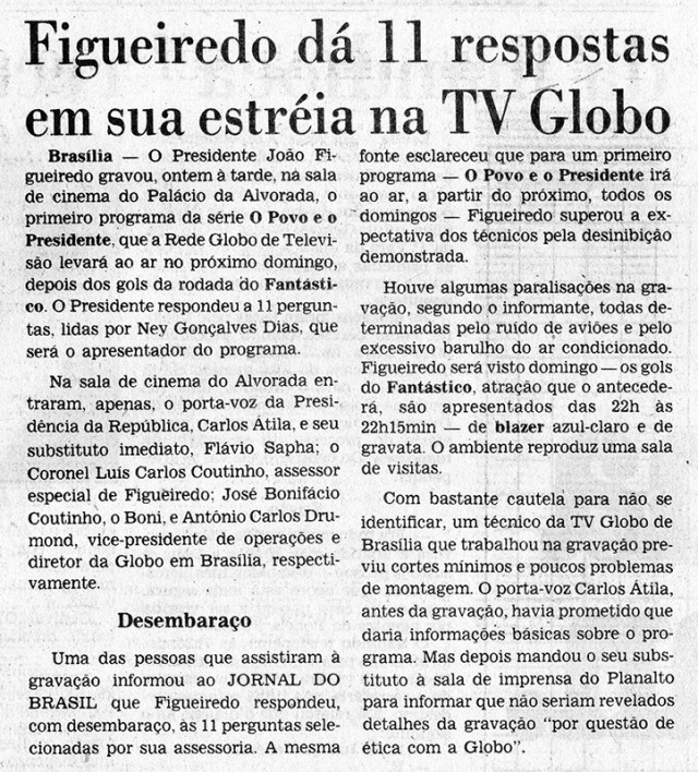 Estreia na Rede Globo de Televisão o programa semanal “O Povo e o Presidente”. Gravado no Palácio do Planalto, tinha o formato de entrevista, na qual o apresentador Ney Gonçalves Dias fazia perguntas de “cidadãos comuns” ao general presidente João Baptista Figueiredo. “O Povo e o Presidente” ia ao ar logo após o “Fantástico”, a maior audiência da televisão brasileira na época, e fazia parte da desesperada estratégia da ditadura para tentar vencer as eleições daquele ano. O programa “jornalístico” constituía uma propaganda tão explícita da ditadura que sua exibição seria proibida pelos Tribunais Regionais Eleitorais de São Paulo e do Ceará às vésperas das eleições de 15 de novembro.