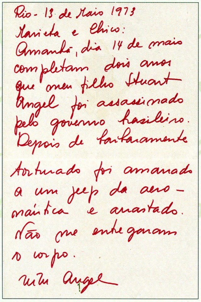 Inconformada com o silêncio da ditadura sobre a morte do filho e da nora, Zuzu Angel iniciou uma corajosa campanha de denúncia dentro e fora do país. Como Stuart herdara do pai a cidadania norte-americana, Zuzu entregou um dossiê ao secretário de Estado Henry Kissinger, que visitou o Brasil em 1976. Também escreveu ao senador democrata Edward Kennedy, que denunciou o caso no Congresso dos Estados Unidos. Em Nova York, a estilista promoveu um desfile de roupas estampadas com anjos feridos e pássaros engaiolados. Atrizes de Hollywood como Liza Minnelli, Joan Crawford e Kim Novak ajudaram a divulgar as denúncias.