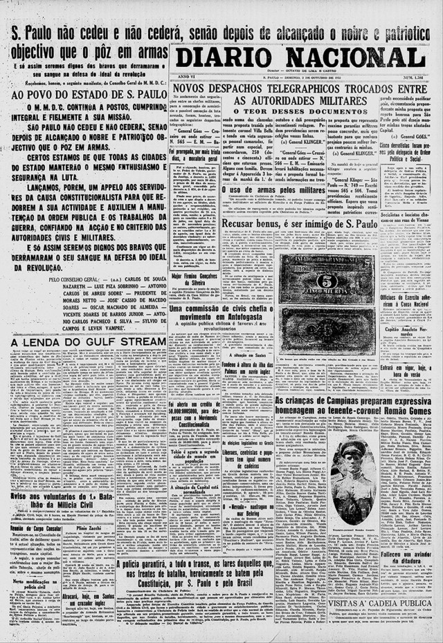 Apesar do telegrama do comandante militar dos paulistas, das evidências da derrota dos rebelados e do grande número de mortos, as rádios e jornais de São Paulo continuaram transmitindo notícias otimistas sobre os combates. A capa do “Diario Nacional”, órgão oficial do Partido Democrático, estampava a manchete: “O Exército Constitucionalista continua a opor invencível resistência às investidas dos ditatoriais”. No fim da página, um alerta: “Enquanto os bravos se batem, é crime imperdoável dar ouvidos aos boateiros e alarmistas, a serviço da ditadura. A nossa fé em São Paulo deve ser inabalável: a vitória é de São Paulo é certa!”.