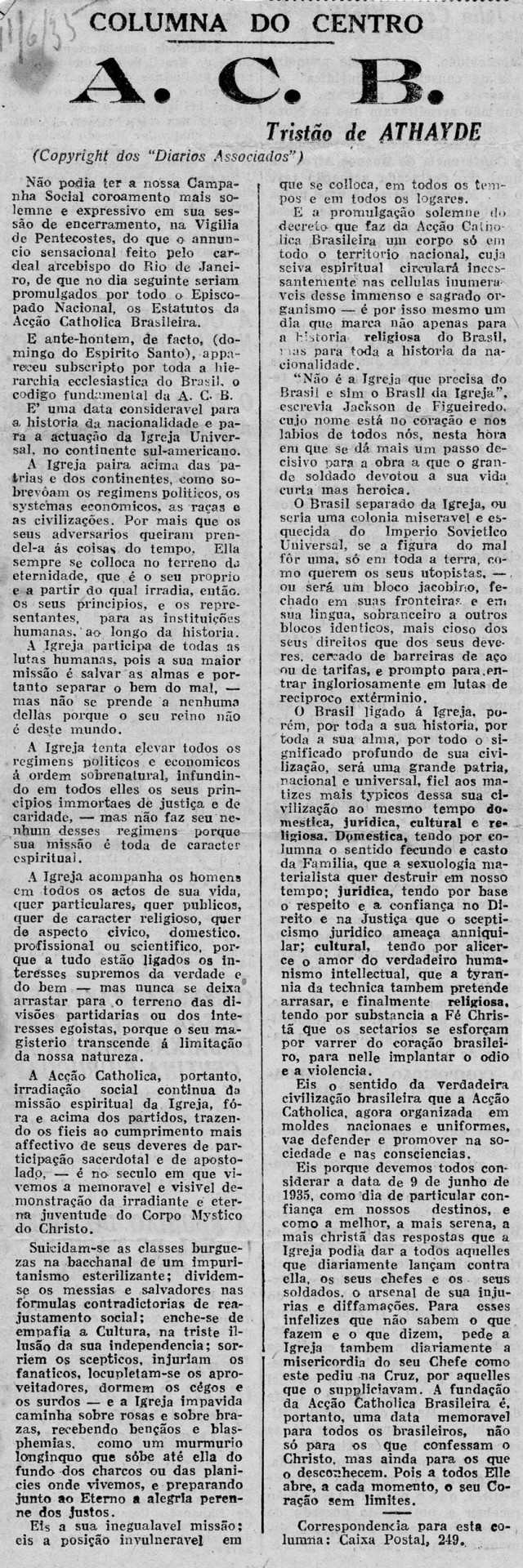 O cardeal arcebispo do Rio de Janeiro, dom Sebastião Leme, anuncia a promulgação dos estatutos da Ação Católica Brasileira (ACB) em todos os estados, dioceses e paróquias do país. O jornalista católico Alceu Amoroso Lima, mais conhecido como Tristão de Ataíde, seu presidente, falou no auditório do Automóvel Clube do Rio de Janeiro, lotado para o encerramento da festa de Pentecostes, sobre as responsabilidades da chamada “milícia de Jesus”. Segundo ele, o Brasil vive uma hora grave, por causa da criação da Aliança Nacional Libertadora (ANL). Para enfrentá-la, ele defende a criação de uma aliança de direita: “essa frente única do bem, sob as várias modalidades que pode assumir no terreno político, social, moral ou intelectual, é uma das necessidades mais urgentes da hora grave em que vivemos”.