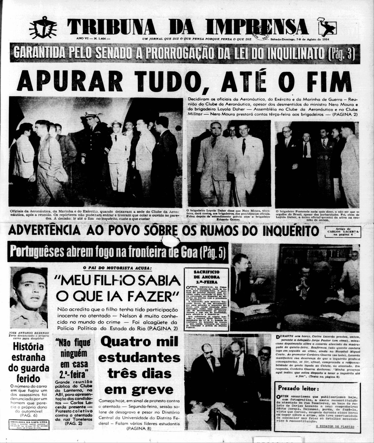 Carlos Lacerda sofre atentado na porta de sua casa, em Copacabana: dois homens disparam vários tiros — dois atingem o major-aviador Rubens Florentino Vaz, que morre a caminho do hospital. Lacerda aparece ferido no pé.