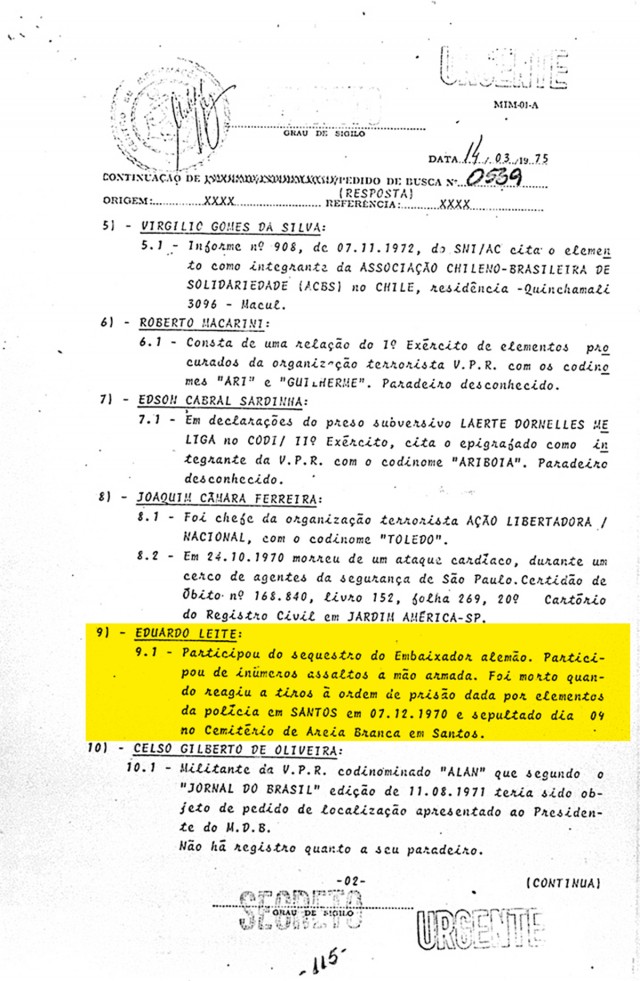 Militante da Vanguarda Popular Revolucionária (VPR), Eduardo Leite, o Bacuri, é morto aos 25 anos, num dos mais cruéis casos de assassinato político durante a ditadura. Preso desde 21 de agosto, foi torturado durante meses e chegou a receber na cela um jornal que noticiava sua fuga da prisão.