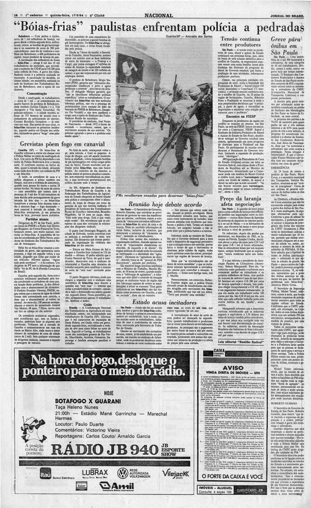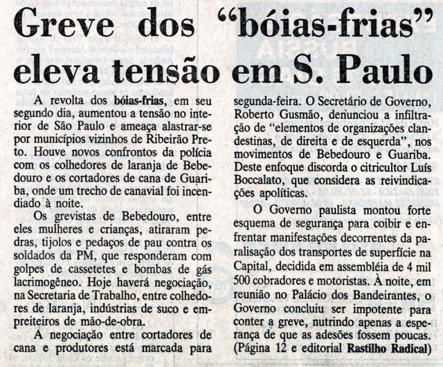 Cerca de dez mil boias-frias (trabalhadores rurais temporários) da região de Guariba (SP) entram em greve por melhores salários, condições de trabalho e de vida. Foi a primeira paralisação organizada por essa categoria de trabalhadores, recrutados para trabalhar na colheita de cana-de-açúcar e de laranja sem carteira assinada e muitas vezes em condições semelhantes ao trabalho escravo.