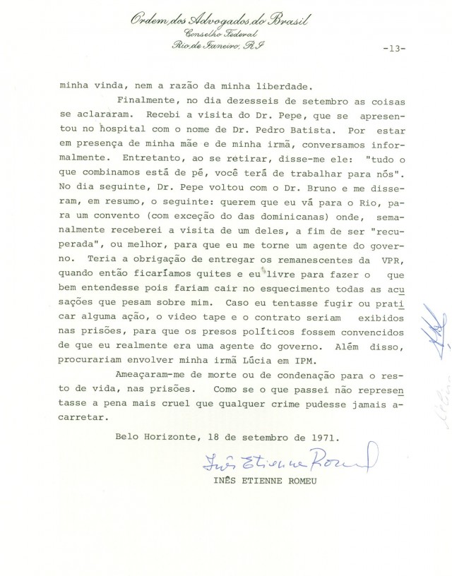 A revelação da existência desses centros clandestinos de tortura e morte só foi possível graças à coragem e à persistência de Inês Etienne. Ela fez uma minuciosa reconstituição dos três meses que passou encarcerada, reunindo evidências para identificar 20 torturadores e 16 presos. A lista de vítimas cresceria nos anos seguintes. Em 2009, Inês recebeu o Prêmio Direitos Humanos do governo brasileiro.
