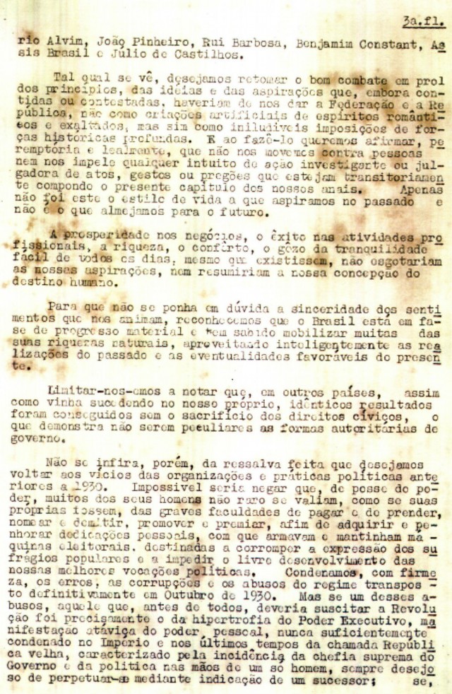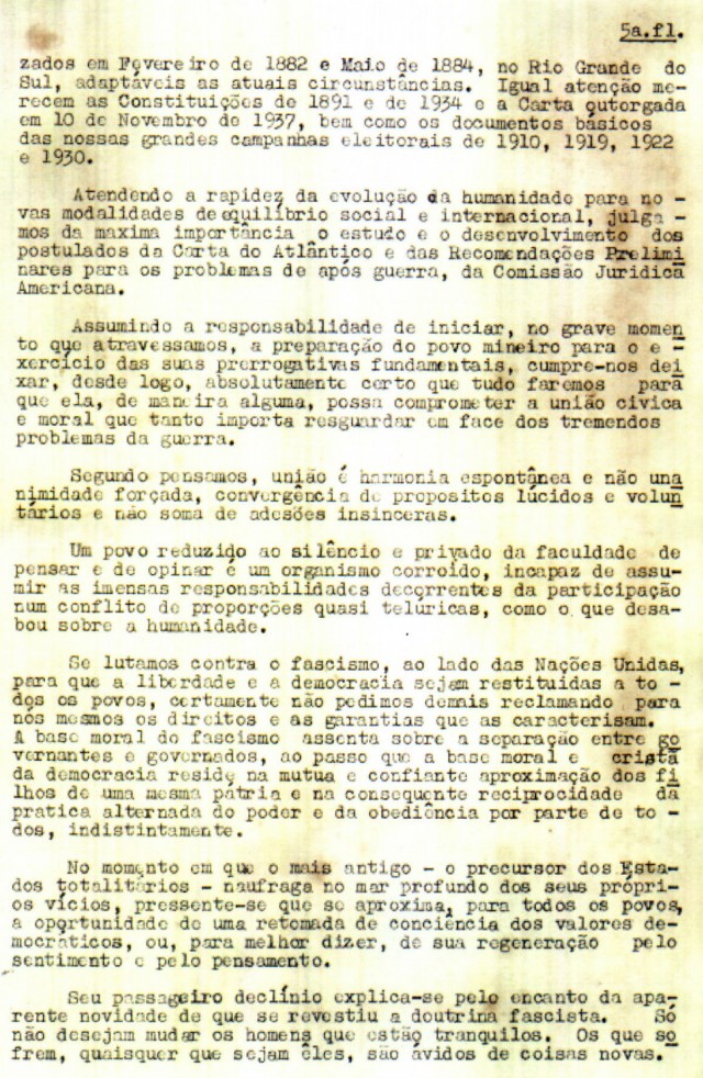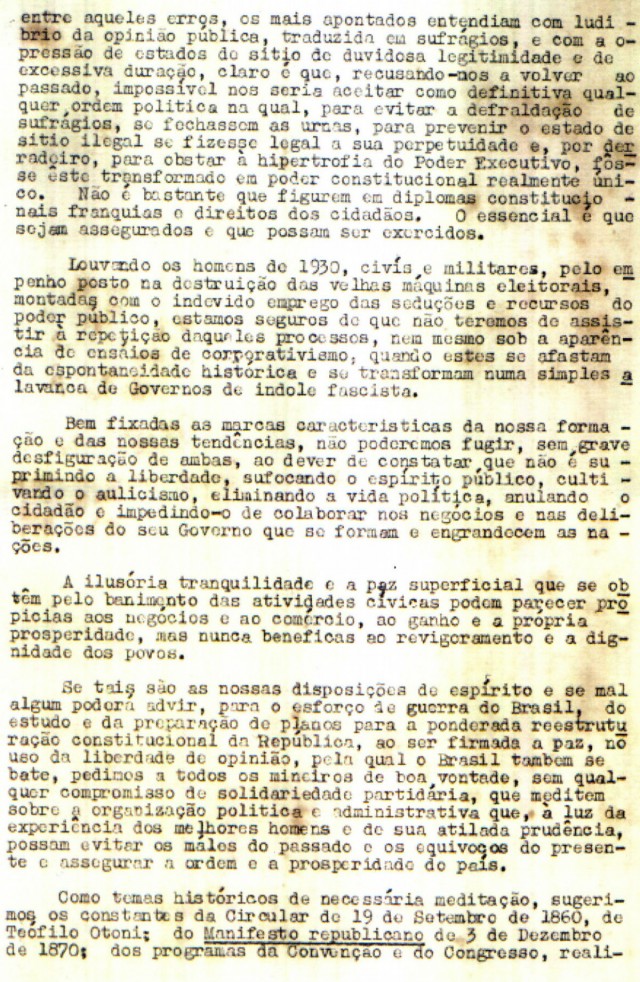 Os mineiros reivindicavam: “Queremos alguma coisa além das franquias fundamentais, do direito de voto e do habeas corpus. Nossas aspirações fundam-se no estabelecimento de garantias constitucionais, que se traduzam em efetiva segurança econômica e bem-estar para todos os brasileiros, não só das capitais, mas de todo o território nacional. Queremos espaço realmente aberto para os moços, oriundos de todos os horizontes sociais, a fim de que a nação se enriqueça de homens experimentados e eficientes, inclusive de homens públicos, dentre os quais venham a surgir no contínuo concurso das atividades políticas, os fadados a governá-la e a enaltecê-la no concerto das grandes potências, para o qual rapidamente caminha. Queremos liberdade de pensamento, sobretudo do pensamento político”.