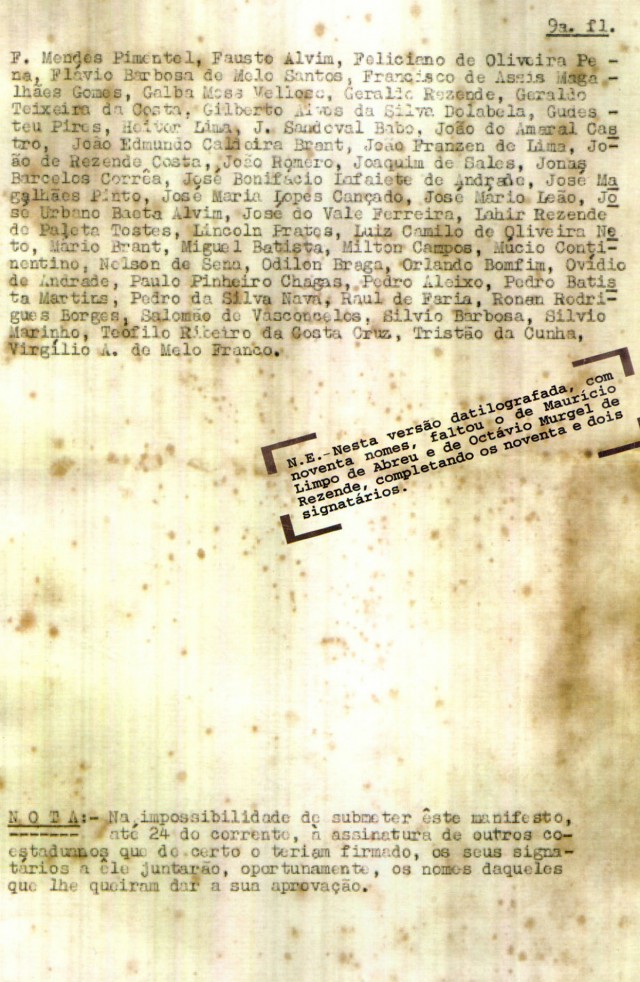 O manifesto, dirigido ao povo mineiro, teve 92 signatários, entre eles Adauto Lúcio Cardoso, Afonso Arinos de Melo Franco, Afonso Pena Júnior, Álvaro Mendes Pimentel, Artur Bernardes, Augusto de Lima Júnior, Bueno Brandão, Dario de Almeida Magalhães, Francisco de Assis Magalhães Gomes, Magalhães Pinto, Milton Campos, Odilon Braga, Paulo Pinheiro Chagas, Pedro Aleixo, Pedro Nava e Virgílio de Melo Franco.