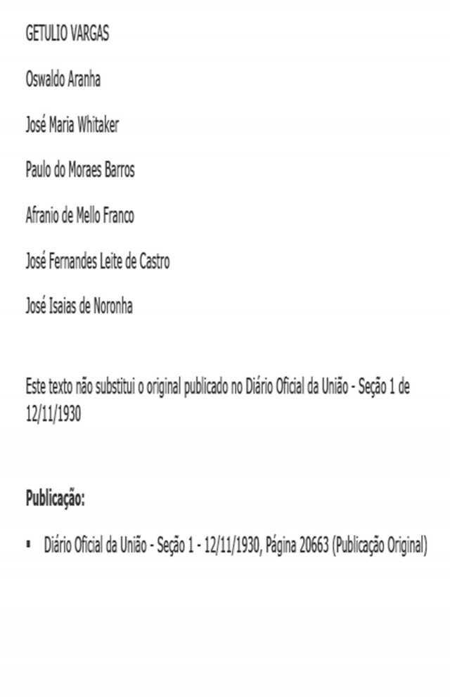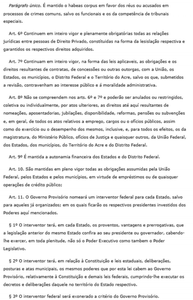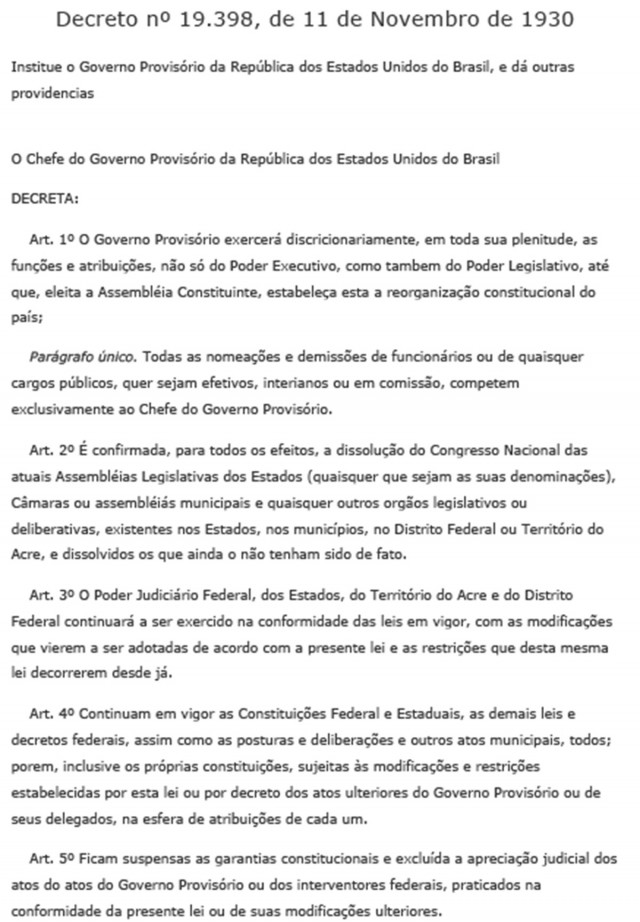 No dia 11, Getúlio assinou o decreto dissolvendo o Congresso Nacional e determinando que o Governo Provisório exerceria também as funções do Poder Legislativo, até que, eleita a Assembleia Constituinte, fosse estabelecida uma nova organização constitucional do país.