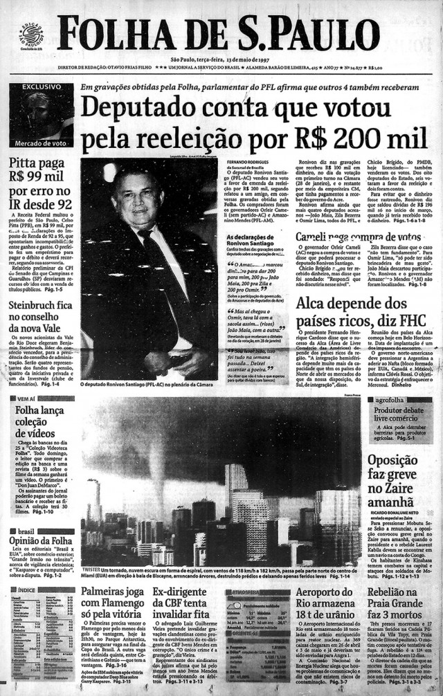 Em maio de 1997, após a votação da proposta em segundo turno na Câmara, quando recebeu 369 votos, o jornal “Folha de S.Paulo” publicou reportagens denunciando que alguns parlamentares teriam ganhado R$ 200 mil para votar a favor da emenda. Em diferentes conversas gravadas, os deputados Ronivon Santiago e João Maia, ambos do PFL do Acre, contaram a um interlocutor terem recebido o dinheiro e citaram outros três deputados que teriam sido igualmente beneficiados. A operação, segundo as gravações, teria como responsável o então ministro das Comunicações, Sérgio Motta, homem forte do governo.