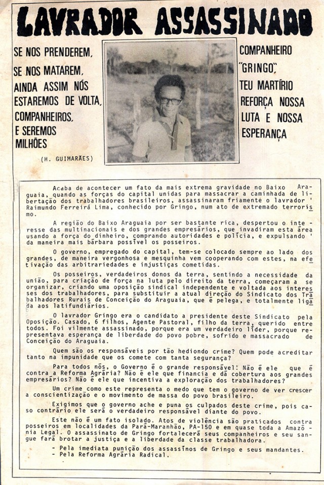 O presidente do Sindicato dos Trabalhadores Rurais de Conceição do Araguaia (PA), Raimundo Ferreira, o Gringo, é sequestrado, torturado e morto por pistoleiros. Gringo era ligado à Comissão Pastoral da Terra (CPT). Na véspera do crime, o padre Ricardo Rezende, da CPT, havia denunciado em Brasília que seis líderes rurais do sul do Pará estavam jurados de morte por grileiros e grandes proprietários de terra. O enterro de Gringo foi acompanhado por cerca de 4 mil pessoas. O caso nunca foi apurado.