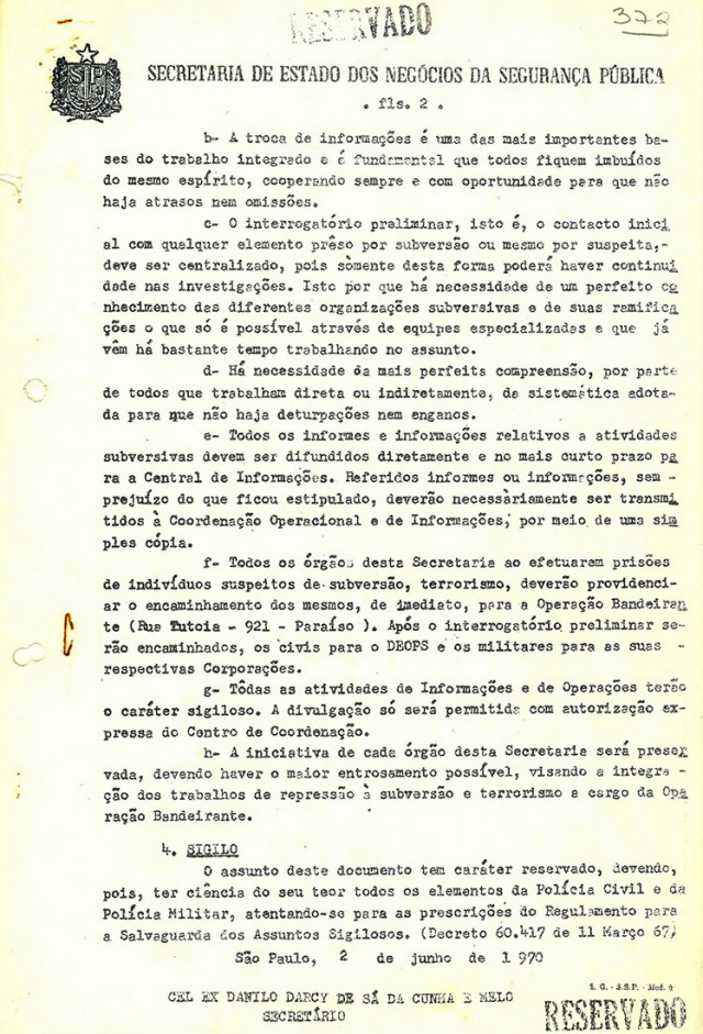 Na presença do governador de São Paulo, Abreu Sodré, e dos comandantes locais da Marinha e da Aeronáutica, o comandante do 2° Exército, general José Canavarro Pereira, lança a Operação Bandeirante – Oban, que viria a ser o maior centro de tortura e assassinatos na ditadura.
