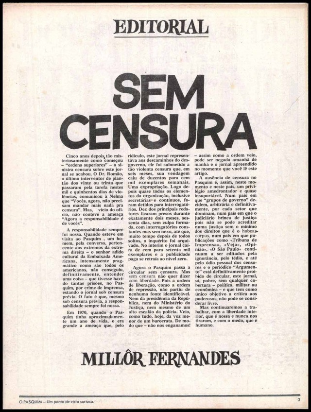 Na capa da edição 300, abaixo do logotipo, o editor Millôr Fernandes publicou um de seus mais famosos aforismos: “Imprensa é oposição. O resto é armazém de secos e molhados”. No editorial intitulado “Sem Censura”, contou aos leitores que o jornal estava liberado do exame prévio dos textos e ilustrações, mas concluiu com uma advertência: “Sem censura não quer dizer com liberdade”. Foi um teste para os limites da “distensão”. Depois da apreensão do jornal, Millôr deixaria "O Pasquim".