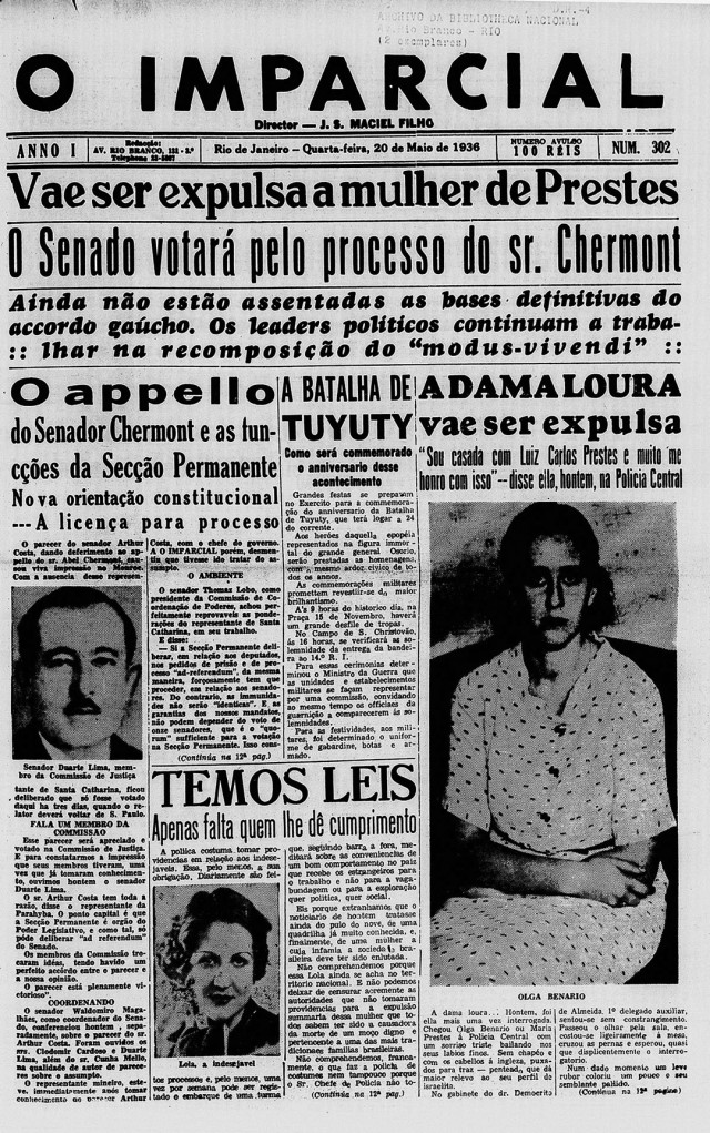 Olga Benário, mulher de Luís Carlos Prestes, é embarcada para a Alemanha. No mesmo navio, segue também Elise Ewert, mulher de Arthur Ewert. O decreto de expulsão do país de Olga Benário foi assinado em 27 de agosto por Getúlio Vargas, que desprezou sua gravidez e seu casamento com um brasileiro, situações que lhe garantiriam a permanência no país.