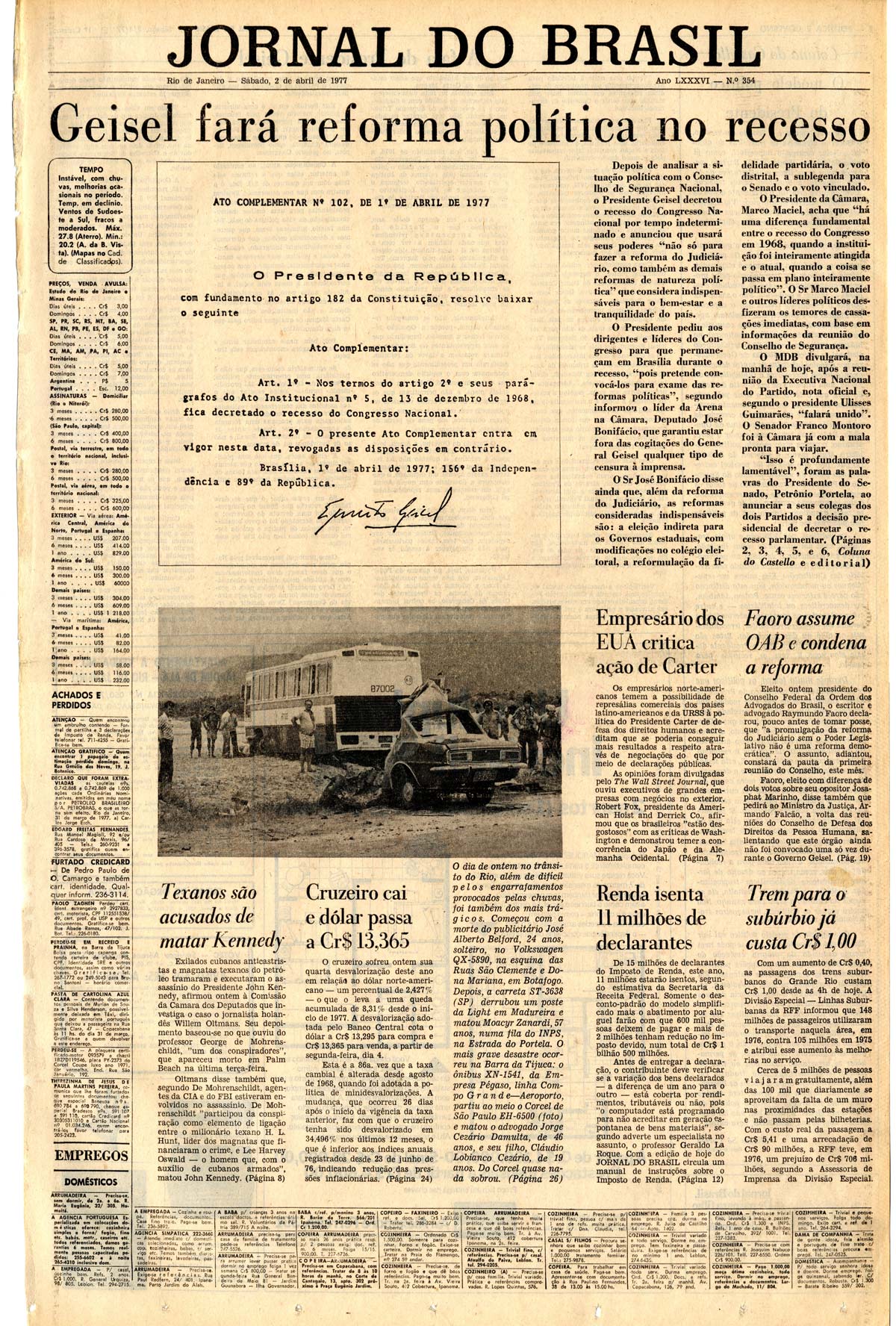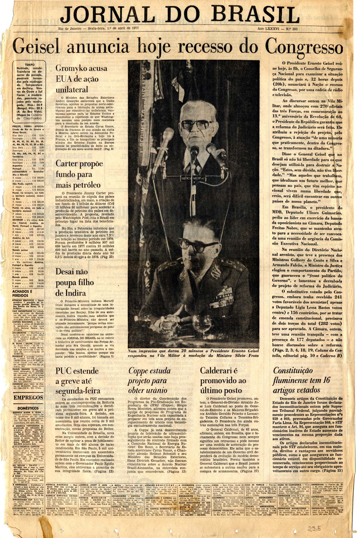 Duas semanas depois de usar o Ato Institucional n° 5 (AI-5) para fechar o Congresso Nacional, o general presidente Ernesto Geisel baixa um conjunto composto por uma emenda constitucional e seis decretos autoritários com o objetivo de conter o avanço eleitoral da oposição e garantir sobrevida à ditadura. O Pacote de Abril, como ficou conhecido, devolveu à Arena o controle do Legislativo, cancelou as eleições diretas para governador previstas para o ano seguinte e determinou a escolha indireta de um terço dos senadores, entre outras medidas. Foi o maior retrocesso político no país desde a edição do AI-5, em dezembro de 1968.