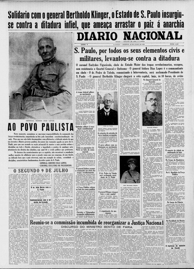 “Neste momento, assumimos as supremas responsabilidades do comando das forças revolucionárias, empenhadas na luta pela imediata constitucionalização do país”. Assim começa o comunicado ao povo paulista, assinado conjuntamente pelo general Isidoro Dias Lopes e pelo coronel Euclides Figueiredo, informando sobre o rompimento com o governo de Getúlio Vargas.