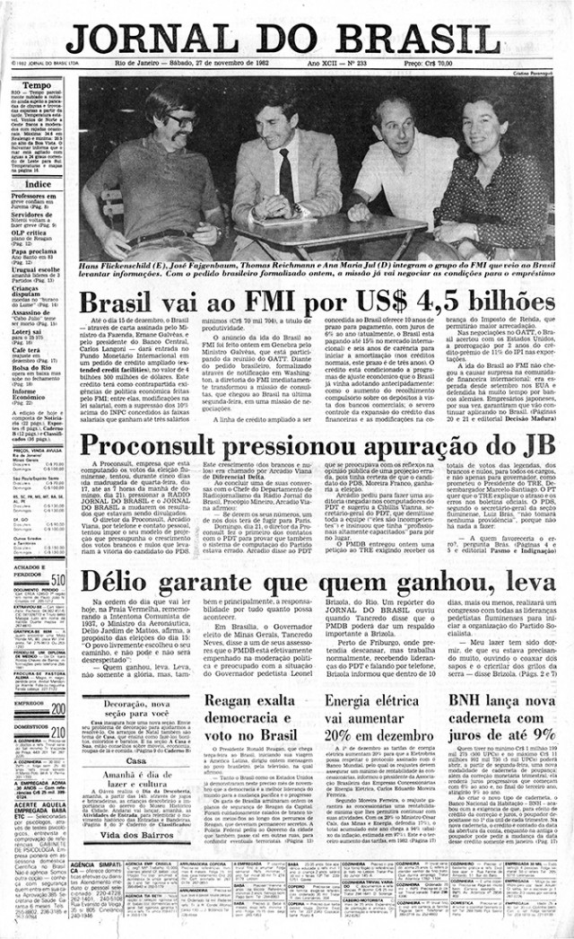 O ministro da Fazenda, Ernane Galvêas, anuncia em Genebra que o Brasil negocia com o Fundo Monetário Internacional (FMI) um empréstimo de US$ 4,5 bilhões, comprometendo-se em troca a arrochar salários, aumentar impostos e restringir ainda mais as importações e o crédito interno. A decisão de recorrer ao FMI estava tomada desde setembro, quando o México entrou em moratória, mas o general presidente João Baptista Figueiredo só fez o anúncio 11 dias depois das eleições no país.