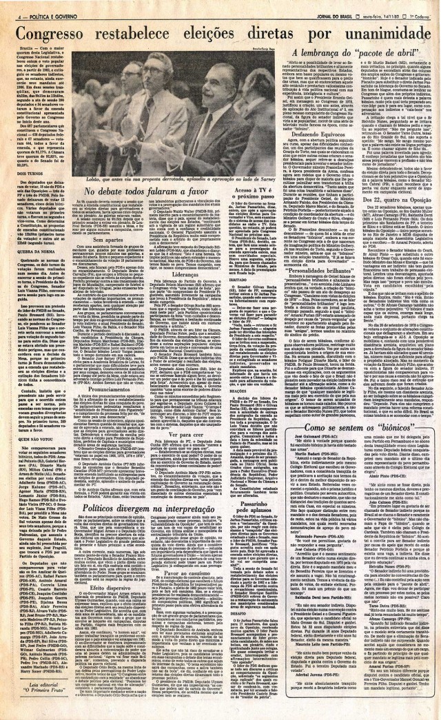 A mesma emenda que convocou eleições diretas para governador extinguiu a figura do senador “biônico”. O mandato dos 22 senadores escolhidos indiretamente em 1978, entretanto, foi preservado. Continuaram proibidas as eleições diretas para prefeito nas capitais e nas cidades de “segurança nacional”. Emenda apresentada pelo PMDB, tornando diretas as eleições presidenciais, foi barrada pela maioria governista.