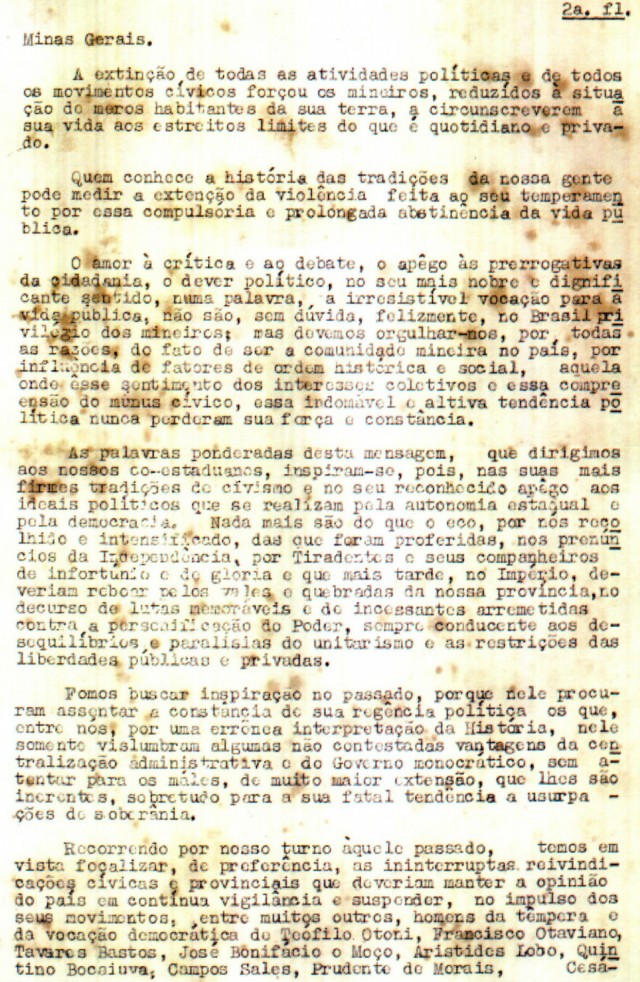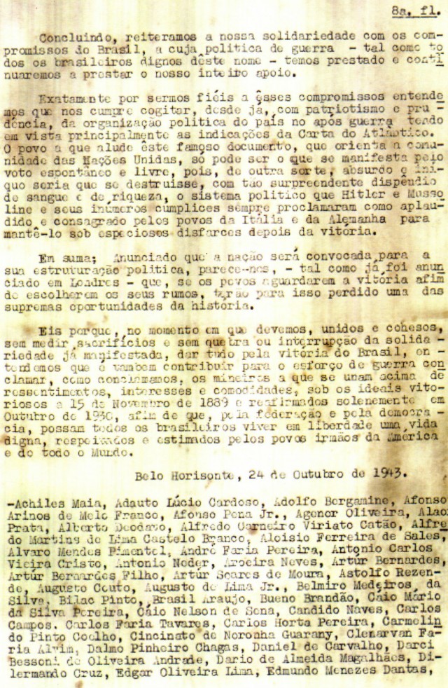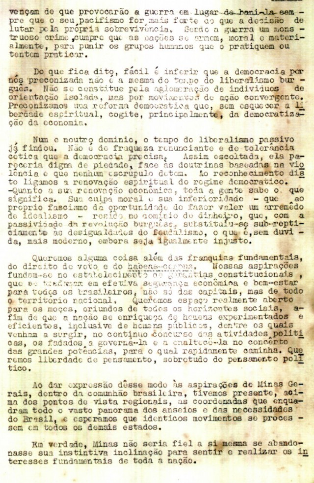 Os mineiros reivindicavam: “Queremos alguma coisa além das franquias fundamentais, do direito de voto e do habeas corpus. Nossas aspirações fundam-se no estabelecimento de garantias constitucionais, que se traduzam em efetiva segurança econômica e bem-estar para todos os brasileiros, não só das capitais, mas de todo o território nacional. Queremos espaço realmente aberto para os moços, oriundos de todos os horizontes sociais, a fim de que a nação se enriqueça de homens experimentados e eficientes, inclusive de homens públicos, dentre os quais venham a surgir no contínuo concurso das atividades políticas, os fadados a governá-la e a enaltecê-la no concerto das grandes potências, para o qual rapidamente caminha. Queremos liberdade de pensamento, sobretudo do pensamento político”.