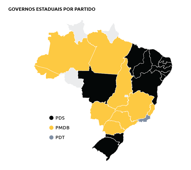 O PMDB elegeu os governadores de São Paulo, Minas, Paraná, Pará, Amazonas, Goiás, Mato Grosso do Sul, Espírito Santo e Acre. Leonel Brizola, do PDT, venceu no Rio. O PDS ficou com os nove Estados do Nordeste, Rio Grande do Sul, Mato Grosso e Santa Catarina. O partido oficial manteve o governo de Rondônia, criado em dezembro de 1981, onde não houve eleições. Na Câmara, o PDS elegeu 235 deputados e a oposição, 244.