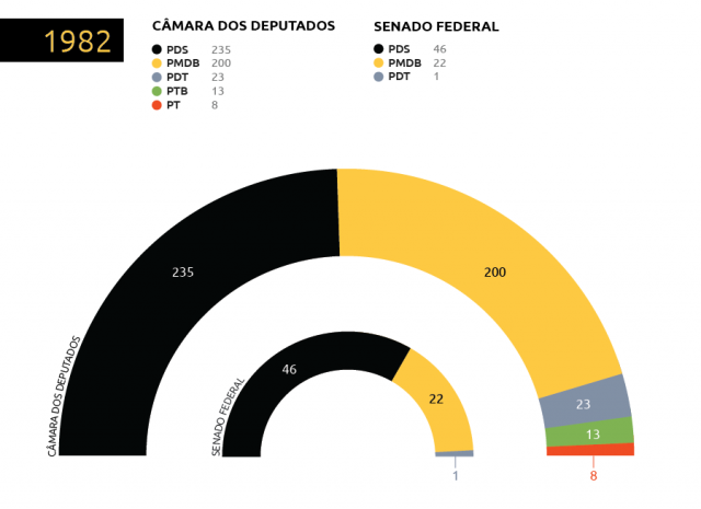 A oposição alcança maioria na Câmara dos Deputados e conquista o governo dos dez maiores Estados nas eleições em todo o Brasil, superando as regras eleitorais restritivas. O PDS manteve o controle do Colégio Eleitoral que indicaria o sucessor do general presidente João Baptista Figueiredo em 1985, mas o projeto de sobrevivência da ditadura foi definitivamente comprometido pelo resultado das eleições.