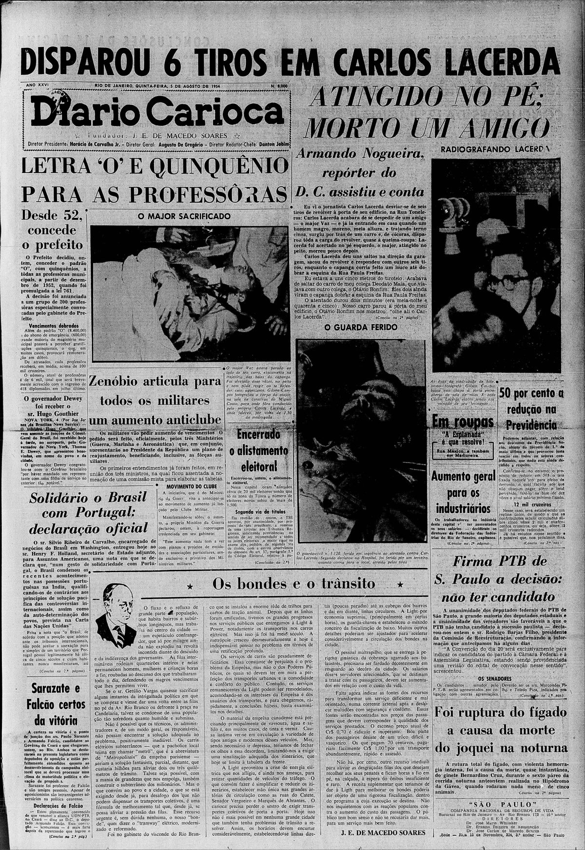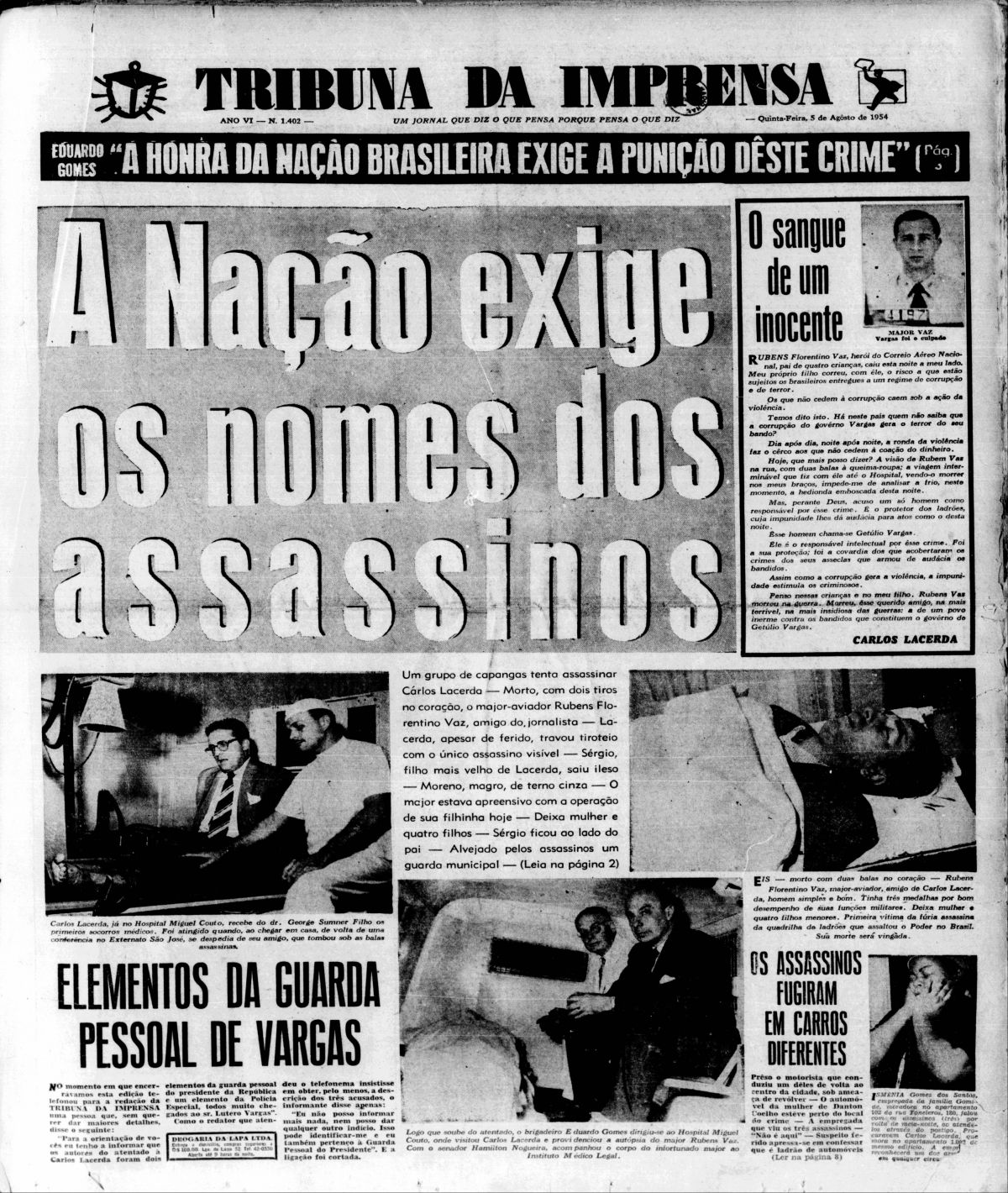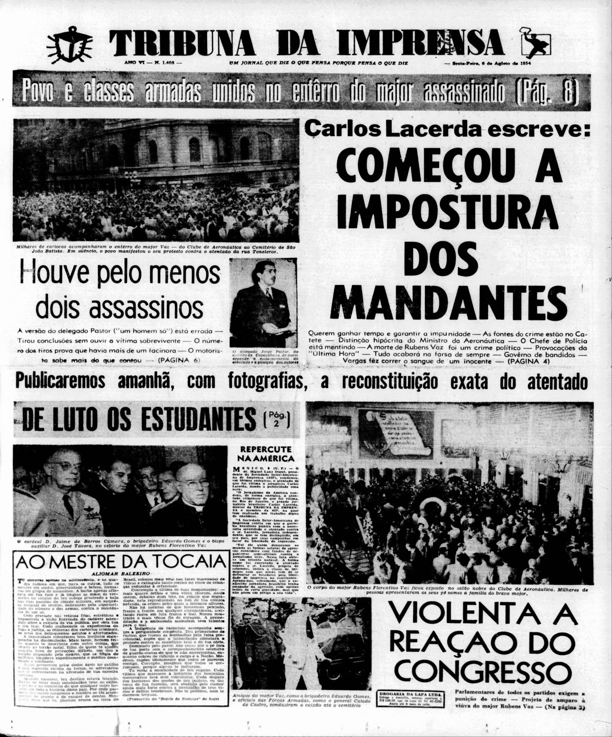 Carlos Lacerda sofre atentado na porta de sua casa, em Copacabana: dois homens disparam vários tiros — dois atingem o major-aviador Rubens Florentino Vaz, que morre a caminho do hospital. Lacerda aparece ferido no pé.