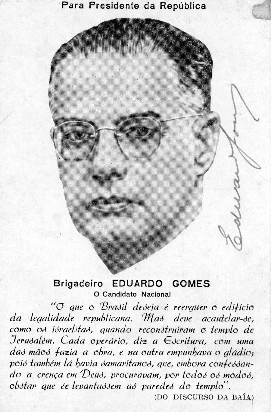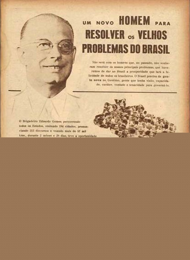 No palanque, o brigadeiro confirmava a imagem de “candidato dos grã-finos”. Defendia o fim do salário mínimo e a “liberdade contratual”, o que enterraria de vez suas chances junto aos mais pobres. Nem seu histórico de defesa da democracia durante o Estado Novo — fama que lhe rendeu chances reais para sua eleição em 1946 — contava mais, pois o ficara para trás na memória do eleitorado.