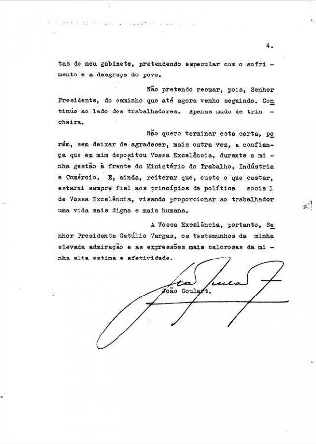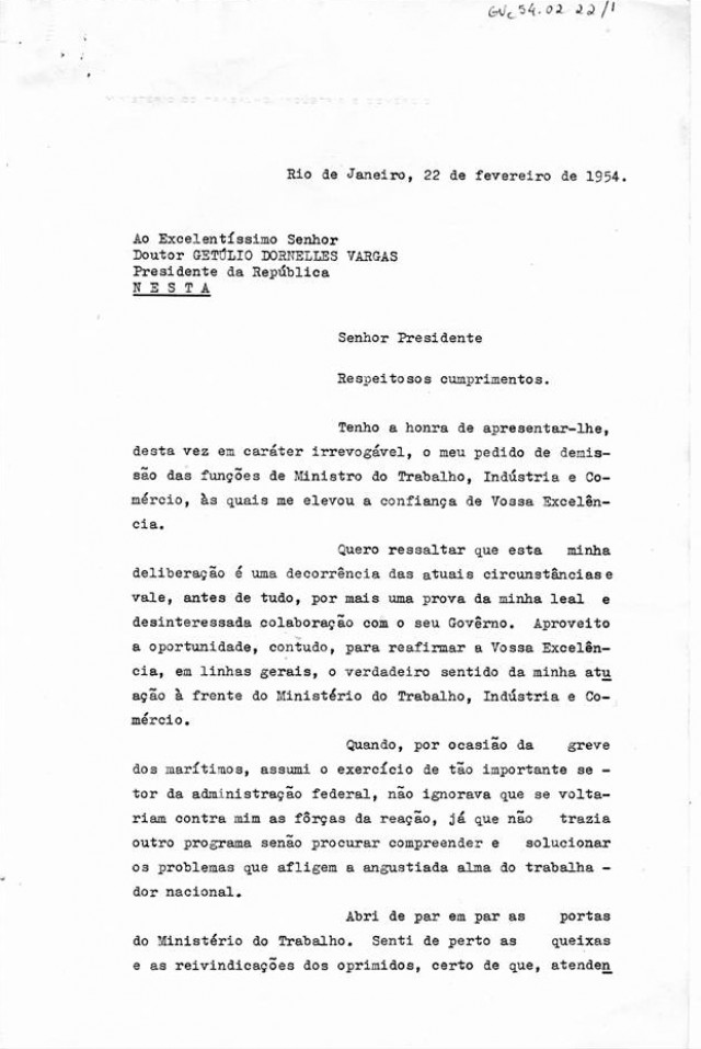 João Goulart entrega sua carta de demissão ao presidente Getúlio Vargas, oito meses depois de assumir o Ministério do Trabalho, Indústria e Comércio.