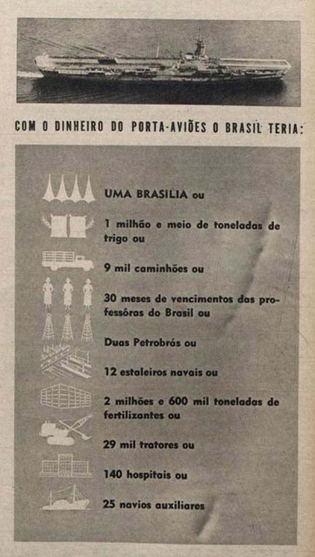 O governo brasileiro compra da Inglaterra, pela exorbitância de 6 milhões de libras esterlinas, o ultrapassado porta-aviões “HMS Vengeance”, construído em 1942. Rebatizado de “Minas Gerais”, a embarcação, pertencente à classe Colossus (intermediária entre o porta-aviões de escolta e o de esquadra), tem 200 metros de comprimento, 70 canhões e capacidade para 1.300 homens e até 35 aviões.