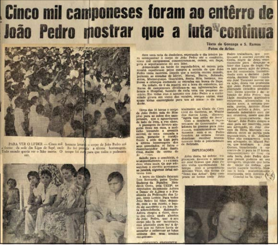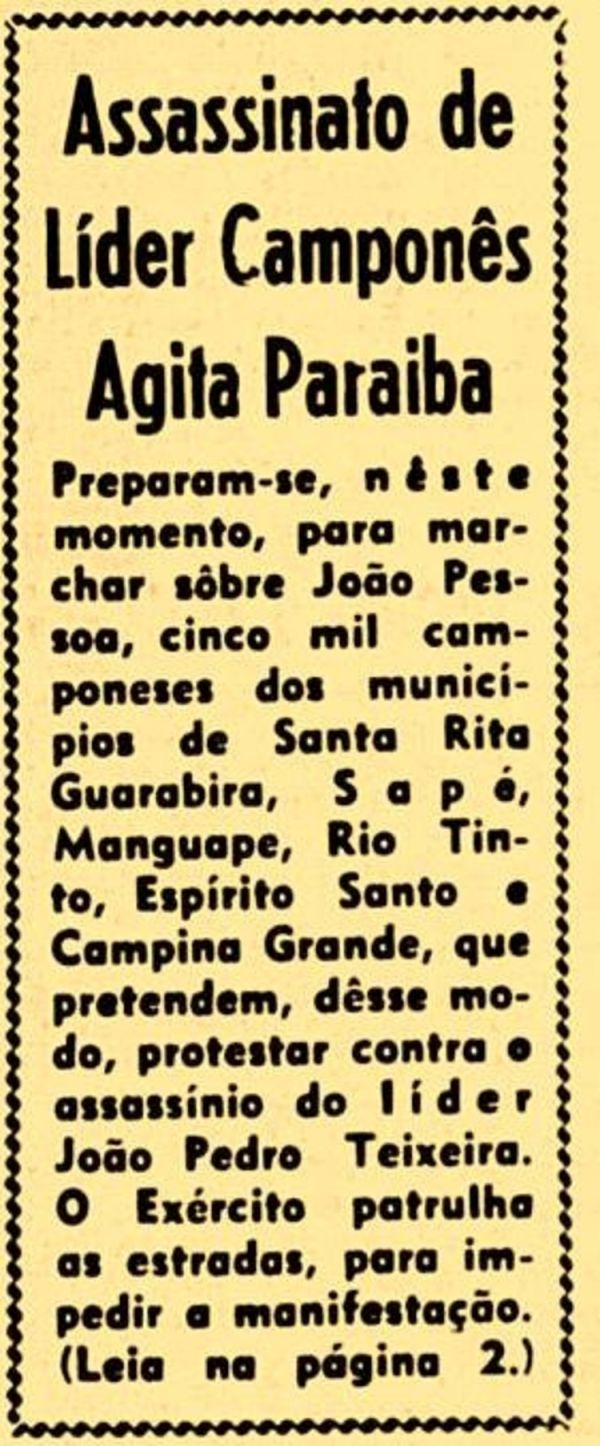 O líder camponês João Pedro Teixeira cai numa emboscada e é baleado nas costas — três tiros de fuzil, disparados por policiais trajados de vaqueiros, a soldo de proprietários rurais de Sapé, na Paraíba.
