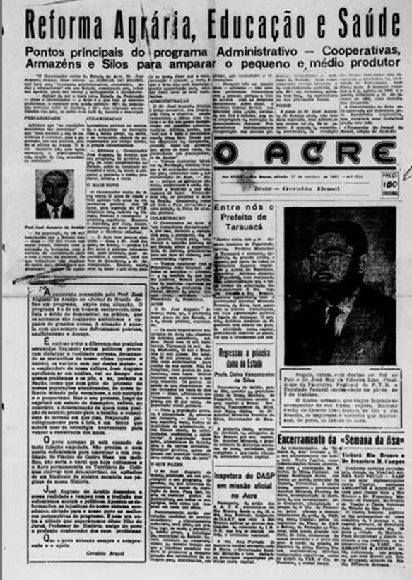 Rio Branco Maio de 1963Em 1962, o território federal do Acre foi elevado à categoria de estado autônomo da Federação brasileira. O primeiro governador eleito por voto direto foi o historiador e geógrafo José Augusto de Araújo, do Partido Trabalhista Brasileiro (PTB). Progressista, José Augusto elegeu-se com um programa baseado no tripé “Educação, Saúde e Reforma Agrária”. Além de apoiar as Reformas de Base propostas pelo presidente João Goulart, ele anunciou a intenção de distribuir terras para seringueiros e lavradores pobres, o que fez dele protagonista de um dos acontecimentos mais polêmicos do período.
