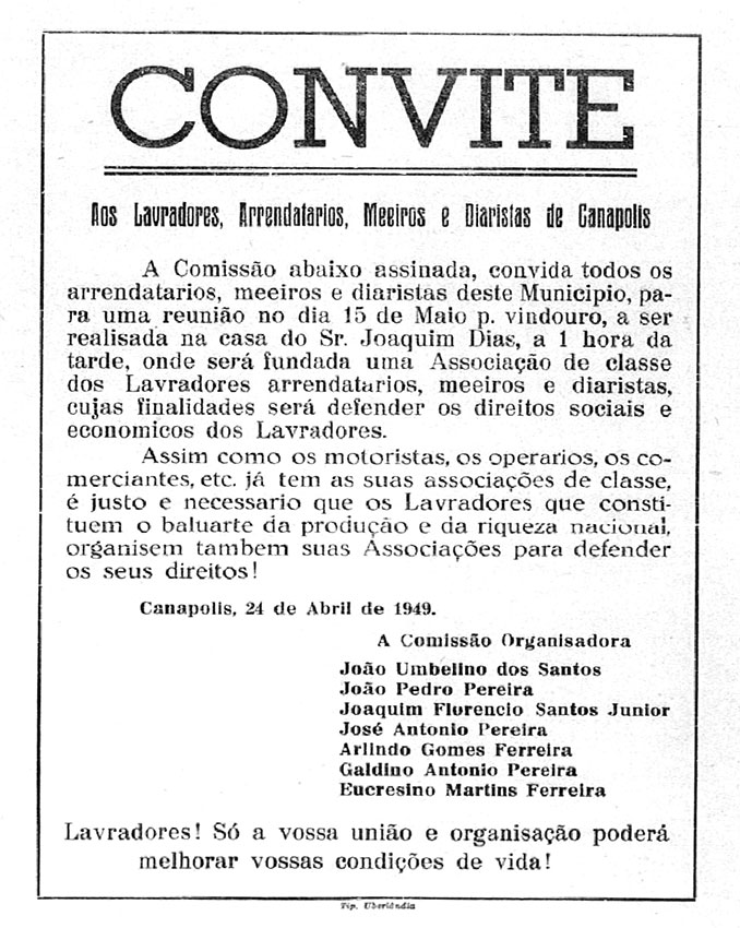 Em meio à acelerada deterioração das condições de vida das famílias de lavradores, a Liga Camponesa de Canápolis, fundada em 1949 com o apoio do Partido Comunista Brasileiro (PCB), decidiu, em assembleia realizada em 23 de fevereiro de 1950, ocupar uma das propriedades do município — a Fazenda Pirapitinga. Também conhecida como fazenda dos ingleses, por pertencer à companhia britânica Southern Territories, a propriedade era uma das muitas que haviam substituído as plantações por pastagens.
