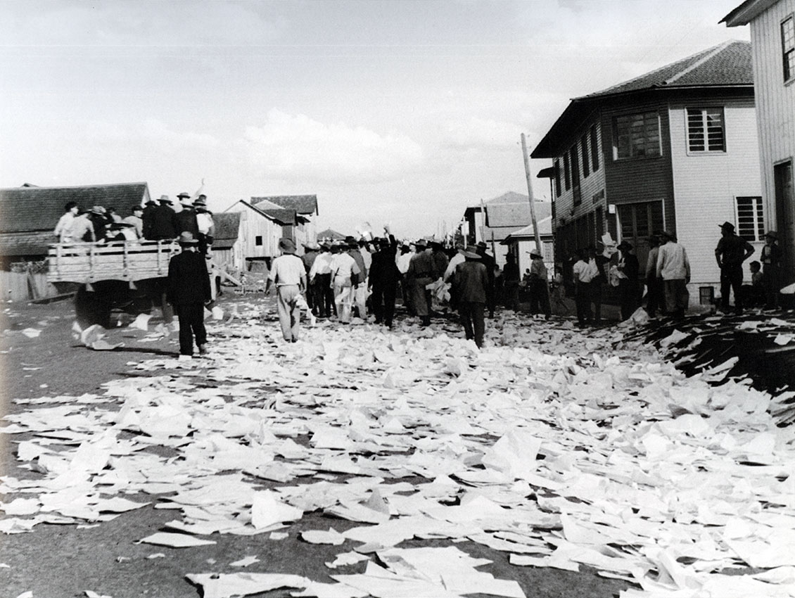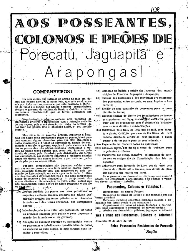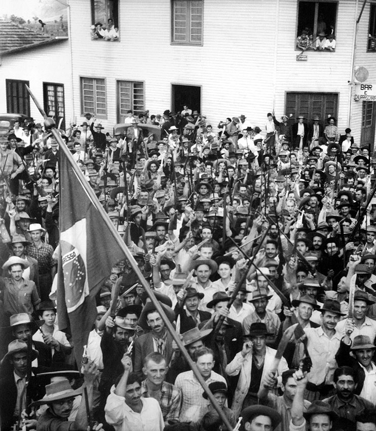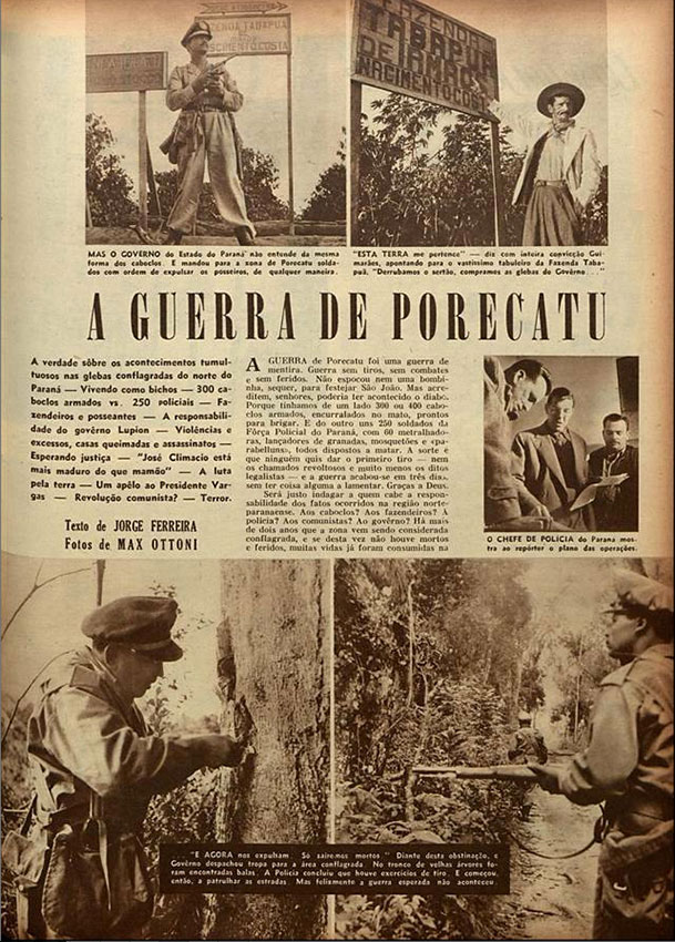 PORECATU 10 DE OUTUBRO DE 1950Na década de 1940, atraídos pelas oportunidades do programa “Marcha para Oeste”, do presidente Vargas, posseiros, pequenos proprietários, trabalhadores e colonos, vindos de todas as regiões do Brasil, ocuparam as áreas rurais de Porecatu, Jaguapitã e Centenário do Sul, na região norte do estado — onde o governo disponibilizara mais de 120 mil hectares para a colonização.