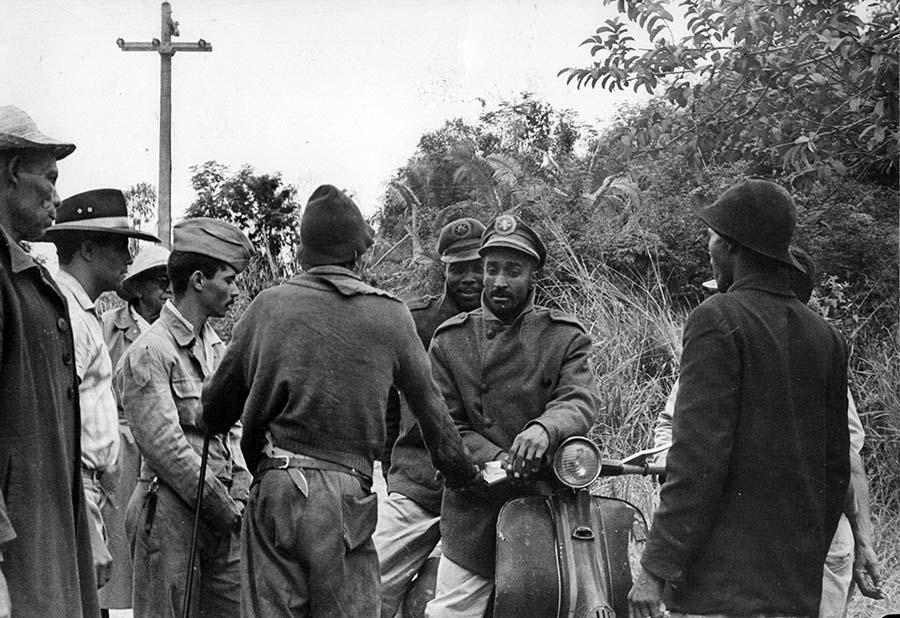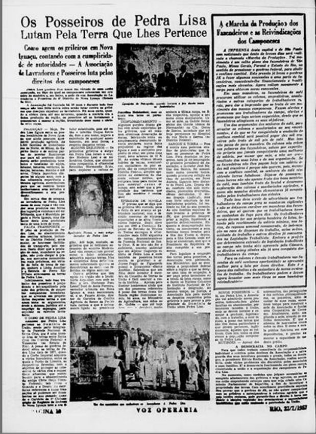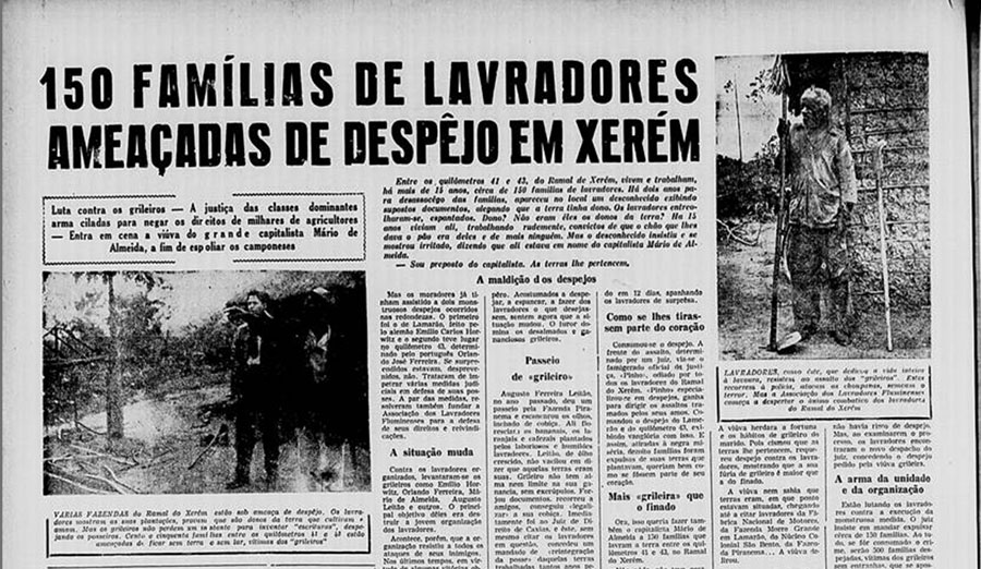 DUQUE DE CAXIAS JULHO DE 1955Na década de 1940, 150 famílias de lavradores se apossaram de uma faixa de terras devolutas na região de Xerém, em Duque de Caxias. A partir de 1952, contudo, esses posseiros passaram a ser ameaçados de despejo pela grileira Carmem Murtinho Almeida, que tinha a colaboração da Polícia Militar para investir contra os lavradores, espanca-los e prendê-los. Três anos mais tarde, o juiz Ari Pena Fontenele deu ganho de causa à grileira e emitiu um mandato de despejo contra os trabalhadores.