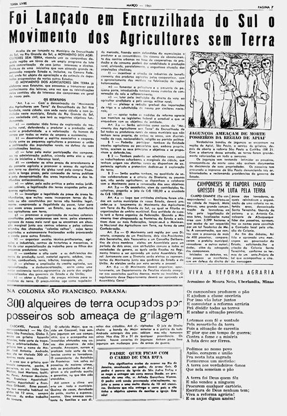 FAXINAL E ENCRUZILHADA 24 DE JULHO DE 1960Na década de 1930, dezenas de famílias de trabalhadores rurais ocuparam 1.800 hectares de terras na localidade de Faxinal, em Encruzilhada de Sul, sudoeste do estado. Passados 30 anos, os camponeses foram judicialmente notificados para deixar imediatamente aquelas terras devido a ação de reintegração de posse movida pelo fazendeiro Euclides Lança, que alegava ser o dono da propriedade.
